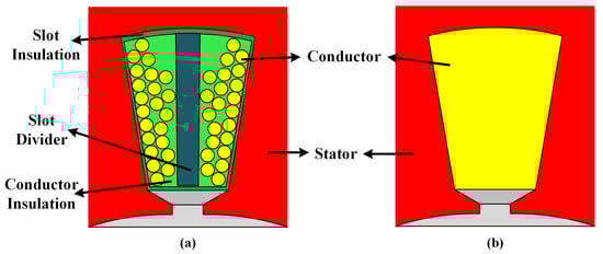 Winding distribution and illustration of slot fill factor. (a) Double-layer winding distribution. (b) Single-turn winding distribution.