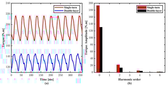 Torque Comparison between five-phase single-turn motor and double-layer motor. (a) Electromagnetic Torque. (b) Harmonic analysis.