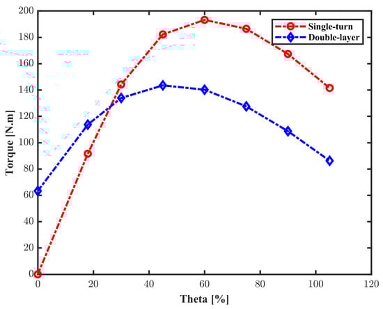 Figure 10 shows the difference between the five-phase single-turn motor and the five-phase double-layer motor under full load conditions. The current amplitude for a single-turn motor is 1500A; the slot-fill factor is considered as 78% for double-layer winding. Therefore, the current amplitude for double-layer winding is only 1170 A to guarantee these motors operate under the same current density condition. As Figure 10 shows, the average torque of double-layer winding is 130.74 N·m, and the average torque of single-turn structure is 193.1 N·m under the same current density condition, which is 47.7% higher than traditional winding structure. In addition, the torque ripple of the single-turn winding structure is 40 N·m, which is around 20% of the output torque. Moreover, since the single-turn motor has a smaller volume, the five-phase single-turn motor will have a higher torque density compared with the five-phase double-layer motor.