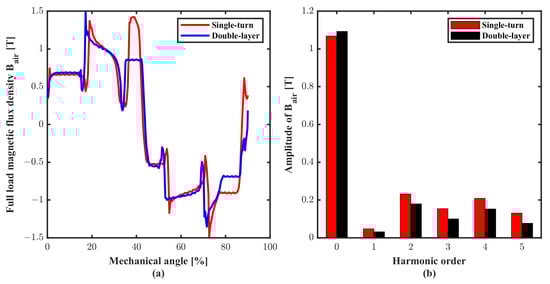 As can be seen from the magnetic flux density cloud map in Figure 12, the magnetic flux densities for the two winding structures are similar. The highest magnetic flux density of the motor is located at the magnetic bridge, which is 2.53 T. The magnetic flux density near the magnetic bridge is saturated, which has a large resistance. The magnetic flux density through the tooth and yoke of the stator are 1.8 T and 1.6 T, respectively. The load magnetic flux density distribution along the air gap and its harmonic component are shown in Figure 13. The fundamental amplitude of for single-turn winding structure and double-layer winding structure are 1.068T and 1.0928T, respectively. The THD for both winding structures are 47.07% and 33.48%.