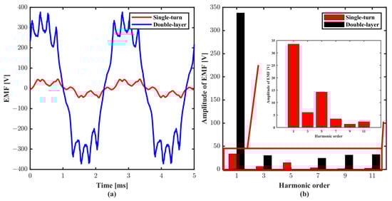 Figure 14a shows the EMF waveform for both winding structures. Figure 14b presents the results of harmonic analysis. The winding factor for the single-turn motor is low, and the THD of EMF is 48.75%. The THD of EMF for the double-layer winding structure is 18.16%. The fundamental EMF amplitude for both winding structures are 33.56 V and 338.12 V, respectively.