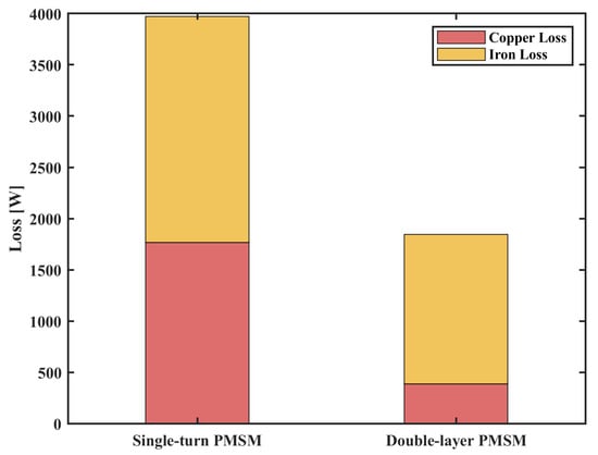 Figure 15 shows the losses for the 20S8P single-turn motor and 20S8P distributed double-layer motor under load conditions. The iron loss for both winding structures is 2204 W and 1460 W, respectively. The copper loss is 1768 W and 387 W, respectively. Since the single-turn motor has a larger current energized into each slot than the double-layer winding structure, the single-turn motor should have a larger copper loss than the double-layer winding structure. The efficiency of PMSM, , for both winding structures, is 95.9% and 97.6%.