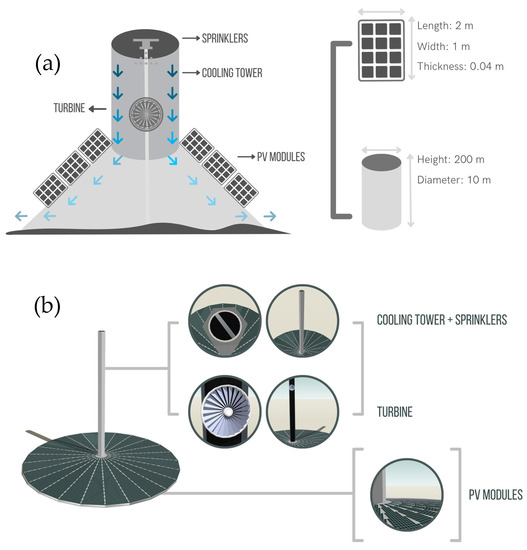 The 200 m-high CT has a radius of 5 m. The top base circumference of the CT is surrounded by sprinklers that are connected to a water reservoir. The turbine is positioned at the bottom of the CT. The 2 × 1 m PV modules are placed on the lower base of the CT in a circular pattern with a radius of the same length as the PV panel. Figure 1a outlines the components’ dimensions and air flow mechanism. Figure 1b illustrates a three-dimensional view of the proposed cooling mechanism.