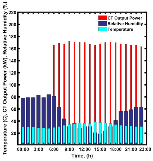 A 24 h profile of electrical power production for the CT, ambient temperature, and humidity on 21 June.