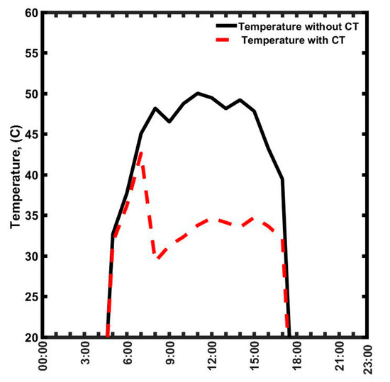 Figure 4 represents the temperature profiles of the PV panels in both standalone (without the CT) and integrated (with the CT) configurations. The profile presented is for a single array of solar panels. The temperature profiles are the same because the PV is not producing heat during the hours of midnight and sunrise, and from sunset to midnight. As shown in the figure, the temperature of the PV panel without the CT begins to rise in the early morning and reaches a maximum of 50 °C about noon. At sunset, the temperature drops till it approaches 32 °C (ambient temperature). This is the average temperature curve of the PV, which is proportional to the ambient temperature and solar radiation. When the PV temperature profile was combined with the CT, however, significantly lower values were obtained. Figure 4 indicates that when the CT started operating in the morning, the cooling effect was negligible due to the minor temperature differential between the water sprayed from the top of the CT and the surrounding temperature. Nonetheless, when the ambient temperature reaches the peak in the middle of the day, the CT produces colder air. Consequently, the best results were obtained when the PV panels were cooled from 50 to 34 °C during noon. Depending on the time of day and weather conditions, the temperature difference between standalone and integrated PV ranged from 5 to 30 °C. As a result, the CT was particularly efficient at cooling the PV panels.