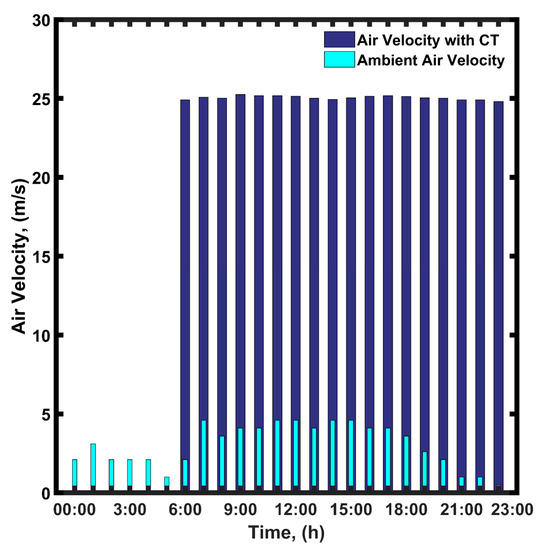 The previous section indicated that the CT effectively decreased the temperature of the PV panels by providing cooler air. This was the result of the cool air’s temperature and velocity. The velocity profile of the air below the PV panels is represented in Figure 5. During a period of 24 h, the wind velocity fluctuates normally between 2 and 5 m/s. As shown in Figure 2, the relevant ambient temperature ranges from 30 °C to 40 °C. These temperatures and wind speeds are inadequate to cool the PV panel. In comparison, the velocity of the cool air produced by the CT is nearly constant at 25 m/s. The graph demonstrates that between midnight and approximately 7:00, the velocity of the ambient air and the velocity of the cool air from the CT are identical. As represented in Figure 2 and described in Section 3.2, the CT was inoperable throughout this time (CT Performance). However, the CT consistently generated cool air from 7:00 until midnight. The PV panels were efficiently cooled by the combination of the high velocity and low temperature of the CT air. Consequently, this will result in increased electricity output.