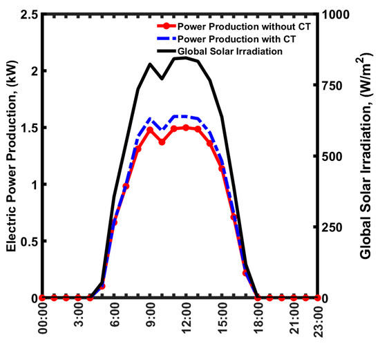 Figure 6 illustrates a 24 h profile of the electrical power generated by the PV panels and the accompanying solar irradiance. The displayed data applies to one array of PV panels. The solid black line represents solar irradiation. The blue dashed line represents the PV panels’ production with the CT, and the red solid line represents the PV panels’ production without the CT. As expected, the production of power follows the pattern of solar irradiation. It began the day at 6:00 with moderate productivity and peaked at noon with 1.57 kW of electrical production. The output decreases in the late afternoon, at approximately 18:00. Consequently, the production of electricity when PV and CT are integrated follows the same pattern. However, the power output profile has increased in comparison to the profile of PV without CT, showing an improvement. The decrease in sun irradiation, which occurred between 6:00 and 8:00, is the reason for the negligible improvement that was observed during that time. In addition, as shown in Figure 2 and Figure 3, the CT was not operable until about 7:00, and the temperature of the air leaving the CT was the same as the ambient temperature. Therefore, the difference in power generation is negligible. In contrast, the significant increase in PV power generation peaked at noon time, which is the highest solar irradiance. At that time, the maximum power output of the PV panels without CT reached a maximum of 1.47 kW. The power rose from 1.47 kW to 1.57 kW when PV panels were integrated with CT. As presented in Figure 4, this can be attributable to the drop in temperature of the PV panels caused by cooled air from the CT.