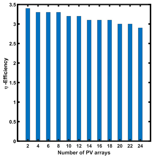 Average annual efficiency improvements of the PV panels for a year vs. the number of PV panel arrays.