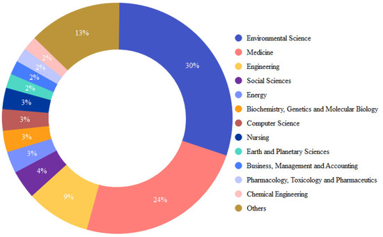 With restriction to the keywords “medical waste” or the equivalent terms such as “healthcare waste”, “biomedical waste” or “clinical waste” and “waste management” searching from the title, abstract to keywords, there are 1900 papers found in the Scopus database without a time limit. Close to 30% of documents discussed this kind of waste and its management from the subject discipline of environmental science. At the same time, medicine and engineering ranked second and third, accounting for 24% and 9%, respectively (see Figure 2).