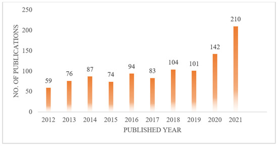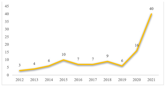 Number of publications in 2012–2021 in terms of “medical waste” OR “biomedical waste” OR “clinical waste” OR “healthcare waste” AND “waste management” AND “sustainability” OR “sustainable development”.