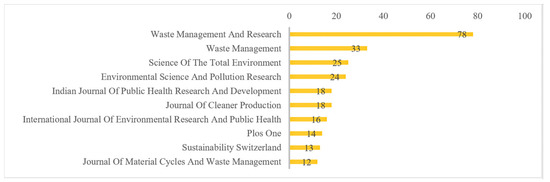 Concerning the publications per each of the abovementioned journals, the trend between 2017 and 2021 is demonstrated in Figure 6. Figure 6 specifically focuses on the publication amount per the most productive journals in the recent five years, which aims to verify whether the published numbers per journal in these five years are consistent with the past trend. Almost all the contributors have published many essays during the past five years, except the Indian Journal of Public Health Research and Development, which has had no new articles in the last two years. The most significant number of publications is recognized as one of the highest productivity in the designated research field. Figure 6 also shows that Waste Management and Research is the most productive and outstanding journal, with an enormous yield to the total publications during these five years, which has leveled out at around six publications per year during 2017–2020 and 11 articles in 2021. Environmental Science and Pollution Research, Science of the Total Environment and Journal of Cleaner Production rank the second, third and fourth most productive publishers in Figure 6, revealing dramatic rises concerning the number of publications in 2020 and 2021.