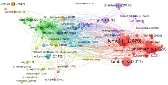 The most influential articles equal the largest number of cited in the accustomed research domain, which reveals the essence and impact of the publication based on the cumulative repetitiveness of citations on the chosen database [24]. Figure 8 visualizes the networks of the selected articles related to “waste management” of “clinical waste” or the same kind of waste. Conjointly, Table 1 lists the elite tenth articles according to the number of citations in terms of the medical waste research field. Under the restraints of the search engine, there are 153 pieces of work with a minimum of 5 citations: 8 articles have already been cited more than 100 times, while 3 of them got larger than 200 excerpts. The most influential article with the highest citations of 389 has assessed various plastic products, especially PPEs in the COVID-19 pandemic and epidemic from the whole life cycle impacting waste management systems and proposed plastic waste footprint (PWF) as the key environmental evaluation indices [25]. The second elite is a review article conducted by Lambert and Wagner [26] with 297 citations concentrated on polymers of bio-based and biodegradable characteristics and biodegradability in the actual waste management structure. Sharma et al. [27] pinpointed threats, opportunities and modernizations for handling solid waste during the crisis of COVID-19 and suggested strengthening the local supply chain post-pandemic from the economic aspect, which ranked the third leading paper and was cited 226 times. Moreover, the initial article on the estimation of disposable masks and medical waste generation in 49 countries in Asia during the epidemic executed by Sangkham [28] ranked fourth, with 150 citations. The fifth influential work implemented by Yu et al. [29], with 149 citations, proved that setting up temporary incinerators could be the most effective way to dispose of the overwhelming medical waste in China.