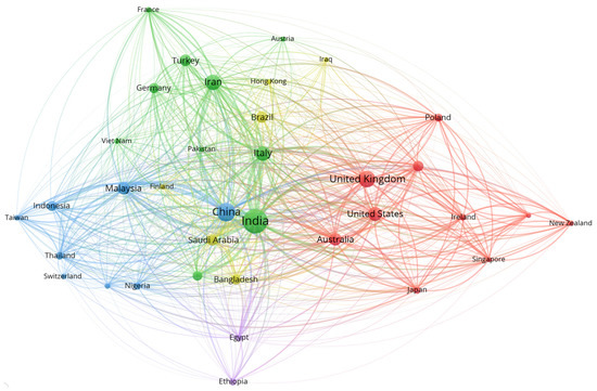 Eighty-four countries distributed the literature in our search domain, and thirty-six have contributed at least three articles. Figure 9 envisages a collaboration network with differentiated circle diameters and link widths, while the number of publications determines the size of circles and the intensity of collaboration between two nodes controls the thickness of connections. Table 2 is the extension and detailed display of Figure 9, it lists the number of publications and collaboration works per the top ten elite countries. For the number of released articles, Table 2 shows India ranked first of 70 publications for medical waste and its management as the most productive country in this research field. China takes second place with 39 pieces of the literature, whereas the United Kingdom (UK) deems third with 32 published articles. The succeeding productive countries are Iran, Italy and the United States (US), with 28, 24 and 23 publications concentrating on medical waste. Regarding collaboration, China, India and Italy are the top three countries, with 52, 50 and 34 collaborating works with other countries. Based on the results of Figure 9 and Table 2, it is evident that developing countries have become notable characters in medical waste-related research. Yet, improper disposal and treatment approaches for handling medical waste have not been rectified in developing nations, which indicates a bridge is required to build between tremendous productivity in scholars and tiny adaptability in practice [35]. Therefore, the efforts of corresponding governmental authorities regarding medical waste management for the top five countries will be further investigated in Section 4.