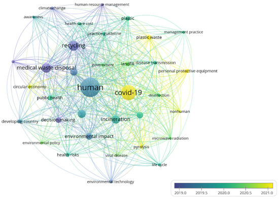 Under the appearance limitation of not less than ten times, 101 of 2939 keywords are formed into a network shown in Figure 10. Keywords co-occurrence represents the frequency of two terms occurring together in a particular article and illustrates the connection between two perceptions, which has been extensively employed in hotspot identification and trend demonstration for the emergent discussion in a specific research discipline [15,36]. According to the overlay visualization in Figure 10, focal points regarding medical waste from time to time are distinctive. Figure 10 displays several sizes of dots with different colors: the diameter of circles equals the number of times occurring in the published works, while the colors are different time periods discussing the terms. The larger the dots are, the hotter discussion of the keywords is; the darker the circles are, the more outdated the hotspots are. Referring to the results of Figure 10, medical waste management and disposal were linked to natural resources and personnel put environmental impacts and sustainable development as the first consideration in 2019. Governmental practice guidelines, several treatment approaches such as incineration, landfill and microwave radiation, also public health were taken into account for managing medical waste in 2020. The dramatically increasing amount of plastic waste as personal protective equipment generated in the novel coronavirus pandemic arouses researchers’ attention to the circular economy and waste-to-energy technology—pyrolysis in 2021.