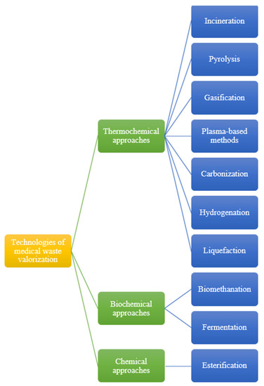 Several papers aimed at waste-to-energy have been broadcast to accomplish more sustainable medical waste treatment. Khan et al. [18] have scrutinized the availability and accessibility of monetizing municipal solid waste through thermochemical and biochemical transformation methods for several developing countries and proved that bio-composting had become the most efficient option for converting solid waste into energy. At the same time, medical waste has been justified and demonstrated to be the ideal stock for pyrolysis, which stimulates bio-products manufacturing and sustainability [2]. Among those earlier works, there is a lack of discussion on both developed and developing nations rather than addressing a specific region that required thoroughly considering several angles of medical waste management, including definition, regulations, strategies and standard and novel thermochemical, biochemical and chemical waste-to-energy disposal methods.