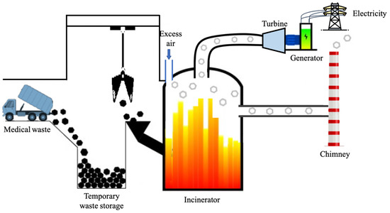 Incineration is the most extensively employed method for medical waste decomposition and disinfection in order to minimize waste size and hazardousness, which allows cutting more than 80% of solid mass and 90% of volume [58]. With excessive air, combustible contents of medical waste are entirely decomposed within 800–1450 °C of the operating temperature as oxidation processes [55,59]. Waste-to-energy is achieved since the heat produced in high-temperature incineration is converted into high-temperature steam, which turns a turbine that activates a steam turbine generator to generate electricity, as shown in Figure 12. Furthermore, incinerating polyolefin plastic waste is a possible solution to produce a substitute for conventional fuel due to the comparable calorific values compared with gas and petrol, which converts medical waste into value-added products to circulate the economy [60]. Medical waste incinerator is potentially competent to be ecological when it provides a particular amount of energy sources for energy recovery practice. Meanwhile, it can be a polluter releasing contaminations counting sulfur oxides, chlorines, carbon monoxides or dibenzodioxins when the flue gases are not suitably handled [54,61]. Additionally, Geyer et al. [62] predicted that almost half of the plastic waste around the world will be handled by incineration in 2050. Hence, clean flue gas systems controlling emissions during waste combustion should be further studied and developed.
