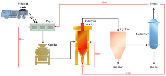 Pyrolysis is a process for thermally decomposing large polymeric molecules of medical waste into smaller molecules in the atmosphere either with inadequate oxygen or oxygen-free. Plastic waste can be thermally degraded at 540–830 °C under no oxygen conditions [69]. Energy supply is necessary for thermal pyrolysis since it is an endothermic mechanism, whereas a catalyst is required for catalytic pyrolysis as catalytic is used to accelerate chain breakages. Differentiations in feedstock and operational conditions during pyrolysis result in different states of final products including solid, liquid and gas [40]. The authors of [70] proved that pyrolysis technology is capable of transforming medical waste into valuable goods containing biofuel as an alternative fuel and biochar as an adsorbent. Pyrolysis of medical waste can generate liquid fuel and become the energy source for turbines to drive generators and further lead to power production [3]. Aragaw and Mekonnen [71] experimented and revealed that approximately 75% of disposed personal protective equipment could be converted into bio-crude oil via the application of pyrolysis and the quality of the product can be further improved if the catalyst is added. The conceptual process of pyrolysis to convert medical waste into valuable products is shown in Figure 14. Pyrolysis is considered more environmentally protected than incineration owing to the relatively low emission of carbon monoxide and carbon dioxide, which is less than 4 vol% and 9%, respectively [72]. Moreover, it was claimed that it may contribute to more available job positions based on a social management analysis of tire pyrolysis [73]. However, this technology consumes a large amount of heat energy and is at the developing stage with the unavailability of waste rubber treatments.