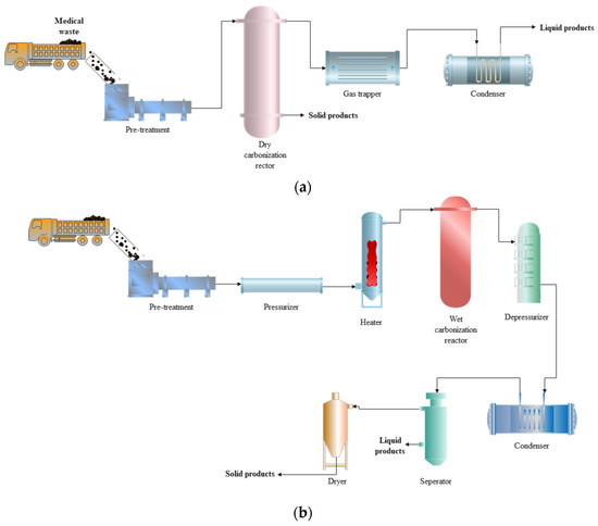 Carbonization is a technology for transforming the carbon of polymer waste into unique homogeneous carbonized items, such as char or carbon-centric products containing carbon fibers and carbon nanomaterials by releasing volatile materials [40,67]. Figure 15 illustrates two classifications of carbonization: dry carbonization (Figure 15a) and wet carbonization (Figure 15b). The former is also named torrefaction, which heats the litter gradually from moisture evaporation in the inert environment of 1 atm pressure and 200–300 °C, and the latter is known as wet torrefaction, which manufactures carbonized products by uplifting temperature within 180–280 °C and saturation 2–10 Mpa pressure [67,79]. Dry carbonization is more straightforward and cultivated than wet torrefaction since there is no requirement for waste pressurization and heating before carbonizing. Heat and high calorific char with low chlorine is the main product of these two processes: low content of calcium for torrefaction but low ash content for wet carbonization [80]. Pre-treatment for moisture reduction in medical waste before proceeding to torrefaction could be eliminated due to the dry basis of medical waste. Though disposable face mask primarily made of polypropylene is a crucial determinant for char production from dry carbonization, the generation of corrosive vapors will lead to environmental deterioration [81]. However, the unavailability for continuous operation and the demands of high-pressure reactors and excessive energy for pressuring and heating medical waste are the drawbacks of wet carbonization [82]. Consequently, applying the carbonization technique to handle medical waste still needs further investigation.
