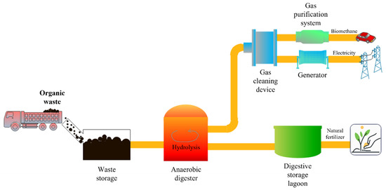 Biomethanation is also named anaerobic digestion, which biologically degrades organic substances of the material to generate valuable products under oxygen-free conditions [92]. Biogas generated by biomethanation is methane-rich gas functioning as a fuel, comprising methane (CH4) of up to 75%, carbon dioxide (CO2) of 25–50% and other gas products. Digestate is also produced, a nutrient supply functioning as fertilizer—Figure 16 exhibits converting organic waste into wealth by biomethanation. Waste of higher moisture levels and organic content is preferable to a biochemical conversion approach for energy recovery. Sewage sludge and food waste are typical ingredients for anaerobic digestion rather than medical waste; thus, this technology will not be further discussed in this paper [93].