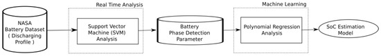 This research uses two techniques to measure SoC. First, by using a statistical-based method using the SVM as in battery application in [21,22]. The second is to use optimization based on linear regression as shown in Figure 1.