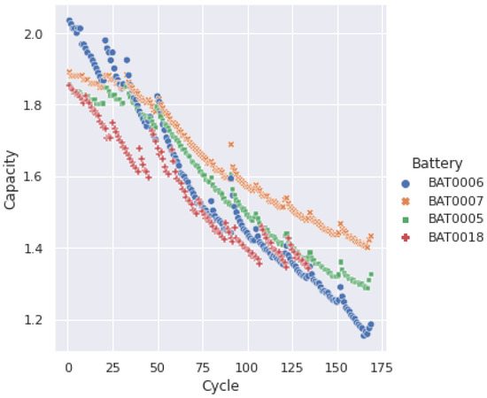 Table 1 lists general parameters of the battery testing process carried out in this study. The four lithium-ion batteries (BAT0005, BAT0006, BAT0007 and BAT0018) undergo three characterization processes. The first stage is battery charge. This is done at the first time with constant current (CC) mode with a value of 1.5 A until the battery voltage reaches 4.2 V. Next, the process is continued in constant voltage (CV) mode until the supply current drops to 20 mA. The second stage is loading (discharge). At this stage, the battery is loaded with the constant current (CC) mode with the same value of 2 A until the battery voltage falls to 2.2–2.7 V. This is considered normal considering that the possible maximum capacity from the battery, as defined in Table 1 as nominal capacity, is 2 Ah. In addition, it is also commonly used to see the conformity of each battery treatment as it would be conducted in many cycles. The charge/discharge processes are repeated until the battery reaches its end-of-life (EoL), where about 30% of its power is lost (1.4 Ah). This data set can be used to predict the remaining battery charge with the existing discharge cycle and also the RUL. Batteries need to be adjusted to the condition of whether the battery cells are in a state of exhaustion and this certainly cannot be deceived by the indicated Ah potential value. The dynamic adjustment of the cell is accomplished by giving the time to the battery to readjust under less loading conditions to return it to its Ah equivalent value under charging conditions. Lithium-cell batteries may be of interest in some high power applications with very large charging capabilities. On the other hand, it is also followed by temperatures that become too hot, which have the potential to reduce battery capabilities and cause some negative issues, such as explosion and fire [5].