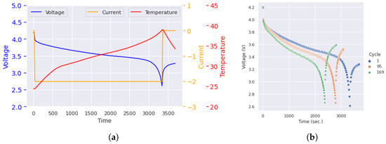 This study uses a battery data set from NASA’s Prognostic Center of Excellence (PCOE). BAT0005 was selected for several initial trials due to its wide use in both industry and academia [19]. This research aims to develop a method for estimating SoC per battery condition using voltage as the most common parameter. Thus, the remaining battery usage can also be predicted. Then, by knowing the profile of the battery SoC, the cut-off voltage of the battery can also be determined; hence, the SoH of the battery can be guaranteed. For this reason, the voltage discharge profile from the NASA data set, which shows the profile of the battery parameters when they are being used, was used. As a comparison, several methods of using the data set in previous works [7,13,19,20] were also considered.