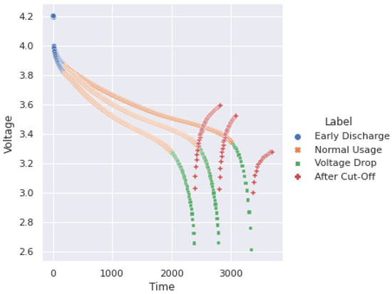 In general there are several characteristics of each phase. For example, only the early discharge and after cut-off phases have positive gradient values. This can also be seen in Figure 6, with the vector pointing up. However, here we do not need to pay attention to the last phase, after cut-off phase. This is because the ultimate goal is to calculate the SoC and predict the end time of the battery on a single charge. In other words, use is only present in the initial three phases starting from early discharge phase to voltage drop phase, after the battery is disconnected we will no longer use it for various reasons, as discussed earlier in Section 2.2. Even if possible, the battery has begun to be reduced in use or is disconnected when entering the voltage drop phase. This can be seen by looking at the characteristic curve of battery usage in Figure 7, where the phase does not contribute a long time and the value will drop drastically, until finally it has to be forcibly disconnected because it has reached the voltage threshold of the battery.