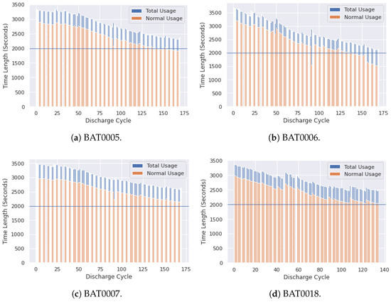 To understand the time estimation, a comparison between normal usage vs. total usage time before cut-off is used to check the difference ratio. From the existing data set, Figure 7 is formed using data of 167 for each of BAT005, BAT006, and BAT0007. Meanwhile, BAT0018 only consists of 132 data. Plots of the data are shown in the bar chart at Figure 8, where the average ratio between normal usage phase time and total usage time before cut-off is 85%. In other words, the ratio between the difference between the two to the total phase value of early discharge and voltage drop phases is only about 15% of the total. Whereas, the cut-off limit of the battery is about 2.2–2.7 V, as noted in Table 1. However, as shown in Figure 8, there is a time span difference between the four batteries. This difference can also be seen in the average length of time from the total time and also from the difference. The average total time is around 47 min with a slight difference in seconds for BAT005, BAT006 and BAT0018, respectively, and 50 min for BAT0007. Meanwhile, the average normal usage time is about the same for 40 battery sequences with a slight difference in seconds, and 43 min for BAT0007 only. Also, the difference between the two values is about 7 for each of the three batteries with a slight difference in seconds, and 8 min for the BAT0007. With the previous cut-off voltages of 2.7, 2.5, 2.2, and 2.5 V for batteries BAT005, BAT006, BAT0007, and BAT0018, respectively; with this method, the battery is in a critical state when it enters its voltage drop phase. Of course it varies more and can be in a voltage range greater than 3 V. The possible values are quite large compared to those in absence of this method. This voltage is represented by V2 in Table 3.
