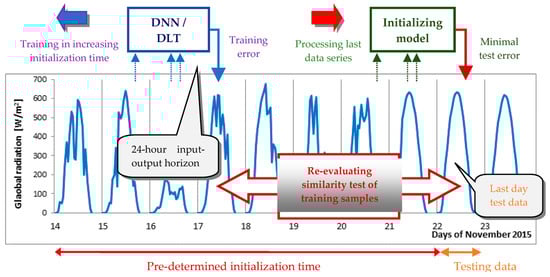 Figure 1 illustrates the assignment of the roughly detected training record resulting from time-range initialization tests in the step-by-step increased validation periods of 2…x days. The applicable day-time intervals of selected data series were then secondarily reassessed, taking into account a defined similarity coefficient value calculated with respect to compared data samples in the latest corresponding day. If the initializing models are unable to compute acceptable testing errors in the latest sequenced data (induced by a passing front), the day-time range is randomly placed in the available data set to find the optimal learning base interval.