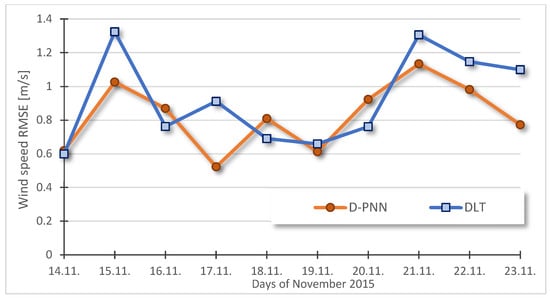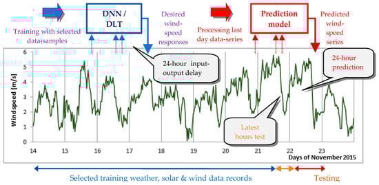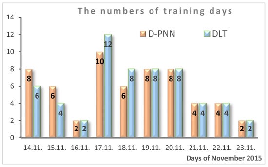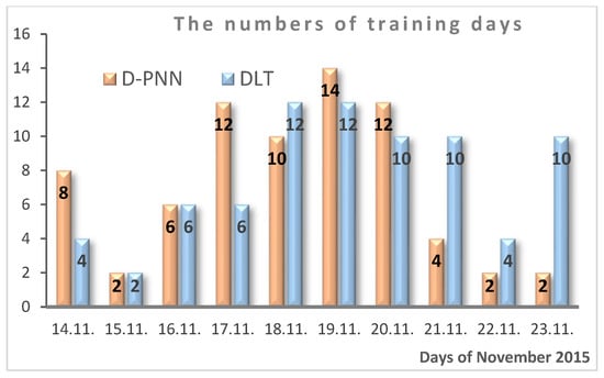An evident drop in irradiation on 16 November (Figure 1) results in an increase in the prediction RMSEs of both the examined DNN, DLT methods in the current and next two days. (Figure 8). A drastic change in the solar pattern from unsettled to sunny days on 21 November also results in difficulties in DL model development (data sample assignment) and a slight increase in errors. However, DNN‘s robust models succeed in eliminating this training handicap. On the other hand, the similarity of day patterns included in the short time period from 17 to 20 November allows for stable AI predictions with a small decrease in errors. Analogous significant differences between wind training/testing and prediction pattern characteristics (gust fluctuations) on 15 and 20 November (Figure 2) affect an accumulative increase in model errors (Figure 9) and lower prediction efficiency. DNN models again partially reduce the impact of unfavorable changes in conditions on AI prediction. Unacceptable increases in daily avg.forecast errors can be suppressed using more sophisticated selection algorithms when searching trainable record intervals Equation (1), according to detected frontal breaks in similar patterns in extended-monthly data sets. The quality of the model approximation usually depends on the optimal predetermination of training and testing sample sets and their applicability in relation to the character of pattern progress and eventual changeovers [].