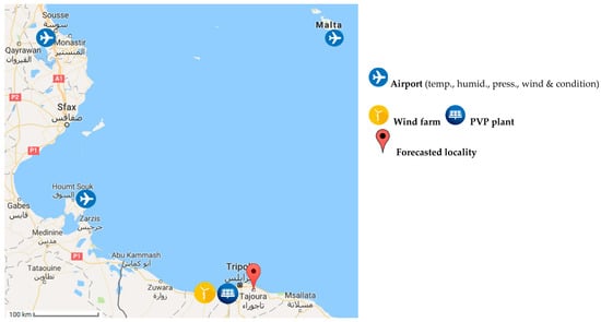 Figure 2 illustrates the proposed prediction procedure applied in the development of solar and wind AI models in the absence of available NWP data. The resulting AI models were tested in the second stage for the latest data patterns to process the unlearned input data in computing the following solar or wind series in the corresponding time []. If the final models do not again obtain an acceptable threshold in testing errors, then their statistical results are apparently inapplicable and useless in prediction. Figure 3 gives a visualization of the ground location and scale distances of the airport observational and target RE production facilities. The airport observation station time in Luqa (+1 h) was necessary to synchronize with the western data recording time zone used in Tajoura, Djerba, and Monastir [,].