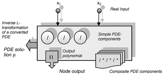 The original inverse L-restoration is necessary to transform the rational Equation (6) or cycle form of the algebraic equations Equation (7), resulting from the initial formulation of PDEs. Two-variable originals uk are produced in selected DNN nodes (Figure 4) in the form of sum PDE modules for the decomposed n-variable function u (3).