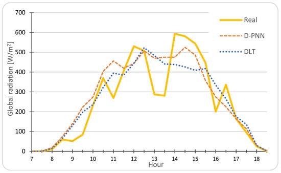 The AI models can accurately approximate the ramping series of a target quantity in changing weather. The character of patterns in the next-day intervals remains unchanged, without significant changes in data involving an essential similarity in progress, as presented in the illustrative day graphs of Figure 6 and Figure 7. Significant breaks in night changes are apparent after 21 November in the form of new pattern characteristics (Figure 1 and Figure 2) that denote a type of sunny and gusty weather. The irradiation record series were standardized by means of the Clear Sky Index (CSI) in nondimensional expression to avoid the use of solar day-cycle-dependent data of the actual sun position about the horizon. CSI standardized data series are computed according to the pre-detected ideal “clear sky” maxima to allow estimates for any hour of day in every seasonal time without the use of absolute radiation data values. The GR data output is re-retrieved from the normal CSI estimate series considering the prediction time []. Periodic quantities (for example, GR, DNI, ground temperature, relative humidity, or direction of the wind) are self-recognized in the development of model structures and the selection of base functions. They are correlated with amplitudes at the corresponding times and are directly modeled in a cycle PDE conversion (7) by formulating model components [].