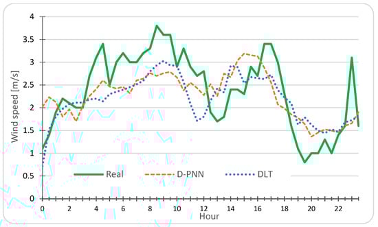 Graphs in the demo Figure 6 and Figure 7 display the first-day real and estimate data series in day periods of 7–19 h irradiance and 24 h wind speed, respectively, computed by the AI statistics DNN and DLT models, including the complete 10-day comparative evaluation in an autumn season.