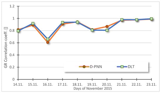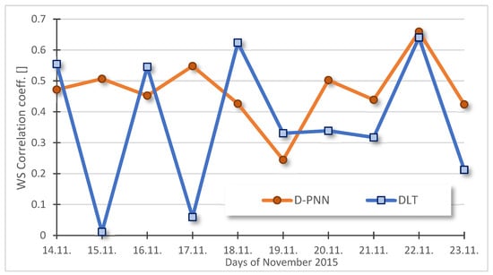 Figure 10 and Figure 11 compare Pearson’s correlation determination coefficient (PDC) for the day-independent DNN and DLT models applied to estimate the next 24-h series in their sequenced computation during the 10-day fall period. Both results from the AI day model statistics are more or less similar in GR forecating, while DNN considerably outperforms DLT in WS. The low-valued PDC alterations (even zero) of DLT indicate its undesirable averaging and less approximation ability in the computation of predicted WS output series as a result of uncertainty in gust variability. Each of the two applied AI modeling strategies gets a slight increase in PDC in an accurate approximation of the day GR cycle series, more than 24 h. forecasting unexpected short-term ramp variances in WS resulting in strong PDC alterations, which imply some instability and less reliability of the DLT models based on LSTM compared with the DNN (Figure 11).