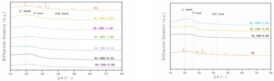X-ray diffraction (XRD) non-destructive testing method is used to determine the crystal structure of lignin and hydrochar at different holding times in the experiment, as shown in