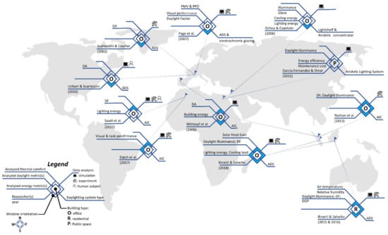 Gordon and Rabl (1992) decreased the system width by 48% to integrate well with the building envelope []. Experiments have shown that the ideal angle is between −37° and +10° relative to the horizontal line for the reflected (exiting) light rays [,]. Using the PHOTOPIA software package and forward raytracing, Wittkopf et al. (2010) quantified and optimized the performance of an ADS. They introduced 2D flux, angular spread, and horizontal offset as new photometric measures to assess the performance and reported that parabolic reflectors could capture more light the larger openings they had. Moreover, such collectors keep the diffuse character of the incident sunlight []. Figure 1 summarizes similar research on using ADS in different spaces.