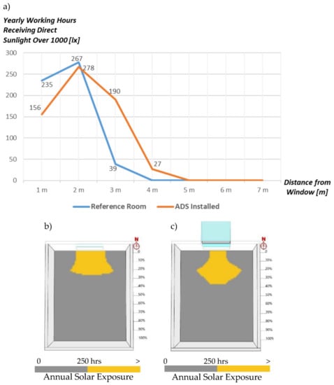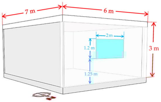 A single dwelling space of 7.00 m × 6.00 m × 3.00 m with a typical north-facing window was chosen as the case room (Figure 2) in Sydney (33°51′ S, 151°12′ E), NSW (south-eastern part of Australia), in a temperate climate. To perform a vigorous analysis and generalize the results, the authors conducted a detailed study on local construction and climate conditions. Only the north-facing façade (the dominant orientation in the southern hemisphere) is exposed to the sunlight, and a window-to-wall ratio (WWR) of 14% was assumed since it is the typical local WWR []. The window-to-floor ratio (WFR) is 10% as utilizing ADS In hot climates requires WFR ≤ 10% [,]. Despite the local inclination of wider windows, a WWR of greater than 35% is never profitable in terms of daylighting quality []. As Ochoa and Capeluto advised, in side-lit rooms with one window located in high solar radiation climates, the depth of the room should not be beyond 7 m, even when using daylighting devices []. Binarti and Satwiko have demonstrated that the application of ADS rooms wider than 6 m necessitates more extensive fenestration that probably increases the solar heat gain []. The areas farther from the window are more subordinated to reflected light from the surfaces around. Although the reflectance factor of indoor surfaces and furniture is low, the rear part of the room looks dim [].