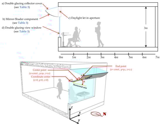 Initially, solar radiation comes to a flat double-glazing cover with an anti-reflective surface (see Table 3), then sunlight falls upon a reflective surface with a reflective specular surface and finally enters the indoor space. In the numerical simulation, for each configuration gradual values of ±1 mm for the coordination of A and B points (Figure 4) to the reference value and regarding the tilt angle of the reflector (α) (Figure 4), an increment of ±1′ were considered.