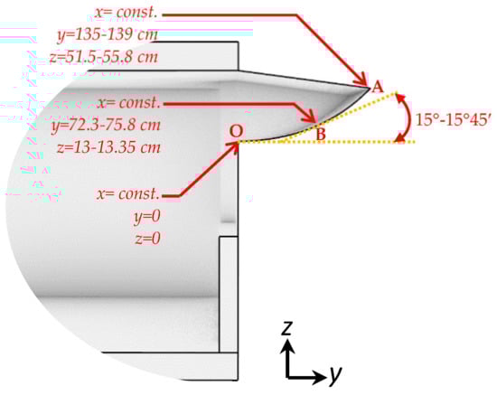 Since the reflector curve was defined by three points (O, A, and B, as shown in Figure 4) and the ADS uses a parabolic mirror [], the authors assumed a parabolic nominal function to optimize the fitting curve. The computational formula adopted for the ADS optic performance, when the sunlight rays reach the ADS vertically, is assumed in the simulation as follows []: