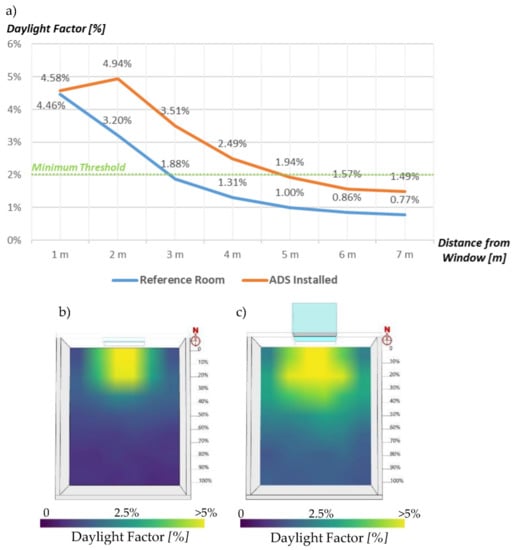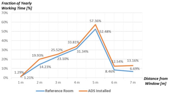 Notably, the ADS is an effective solution when there is some external obstruction in daylight admission []. Kontadakis et al. (2017) considered this system as an easily mounted and various shape daylight-controlling system for side-lit spaces []. The ADS can enhance indoor visual comfort under a high luminous sky by providing a congenial luminous environment, keeping a more homogeneous daylight distribution, and reducing discomfort glare probability []. The ADS does not provide indoors with excessive indirect sunlight, which causes glare and overheating under a sunny sky [], while an integrated ADS can improve indoor luminous performance by a higher Daylight Factor (DF) and work plan illuminances (at the rear part of the room) and improve Daylight Autonomy (DA), not at the expense of visual comfort []. Anidolic shelves used in urban districts can increase DF compared to conventional double glazing, even up to 1.7 times in the deeper parts of the room; this increase was the value of the reference case [,].