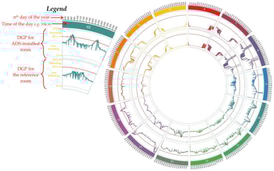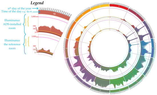 Daylight penetration significantly affects building thermal-daylighting performance [] since daylighting and heat are highly correlated []. Daylighting is an invaluable tool that provides a natural, pleasant environment in terms of the quality and source of energy saving in buildings which does not need deteriorating natural resources without energy conversion loss. Therefore, penetration serves a dual function of permitting sunlight and creating a pleasant indoor environment [,], which positively affects occupants’ health [,]. Fixed shading devices need a complex design for the given site to avoid excessive blocking of daylight which could consequently increase artificial lighting [].