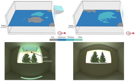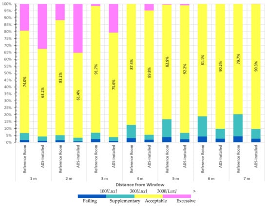 Rightly installed on a window top part, most daylighting systems have demonstrated a great potential “to capture sunlight under clear and/or intermediate sky conditions and redirect the direct component of daylight toward the room ceiling fraction closer to the window” [] and be a promising daylighting solution []. In an analysis of the impacts of light shelves in office spaces in Toronto, Canada, Berardi and Anaraki (2015) concluded that a constant increase in Window-to-Wall Ratio (WWR) reduces Useful Daylight Illuminance (UDI) of the near window area and increases UDI for the back part of the room [].