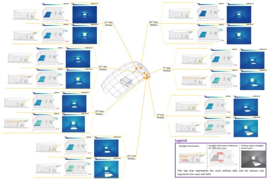 More recent attention has focused on the provision of daylight in the rear part of indoor spaces (i.e., core daylighting) in designing sustainable buildings []. Especially during the cooling season, when the sun is high, deep rooms experience uneven daylight distribution that identifies additional artificial lighting which leads to the overuse of electricity []. Passive daylighting systems which are affordable and require minimum maintenance can provide indoor daylight and ventilation simultaneously [] and increase daylight homogeneity. A compound shading–redistributing system can alleviate the problem of daylight over-provision near the window and under-provision in the rear part of the room. However, extending window dimensions can mitigate the illumination problem but activate the glare problem, which often results in close internal shadings and turning lights on [].