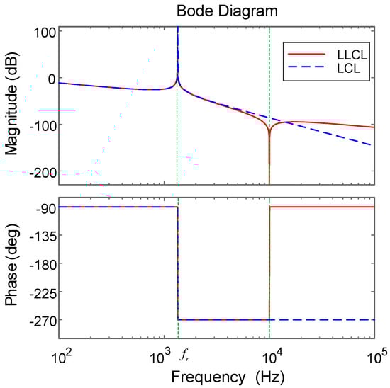 From the transfer functions of the LCL filter and LLCL filter, their Bode diagrams are plotted in Figure 3. Since the value of is extraordinarily little, the resonant frequencies of the LLCL filter and LCL filter are nearly equal. They have the same harmonic attenuation capacity of −20 dB/dec in the low-frequency band. In the middle-frequency band, they are both −60 dB/dec. The LCL filter still attenuates by −60 dB/dec in the high-frequency band, while the LLCL filter drops to −20 dB/dec. However, because of the existence of the LC resonant branch, the LLCL filter generates an anti-resonant peak at the SF, which advances the harmonic suppression performance of the filter. Therefore, the harmonic suppression capability of the LLCL filter is greater than that of the LCL filter.