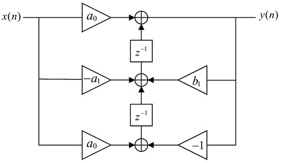 It should be pointed that, as shown in (11), the transfer function of the BF given by (10) is characterized by three parameters , , and . Therefore, the BF could be easily implemented in a digital signal processor by using the Transposed Canonical Form, as it is shown in Figure 4.