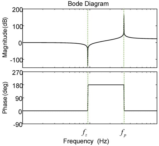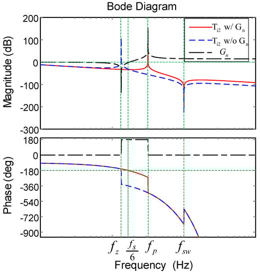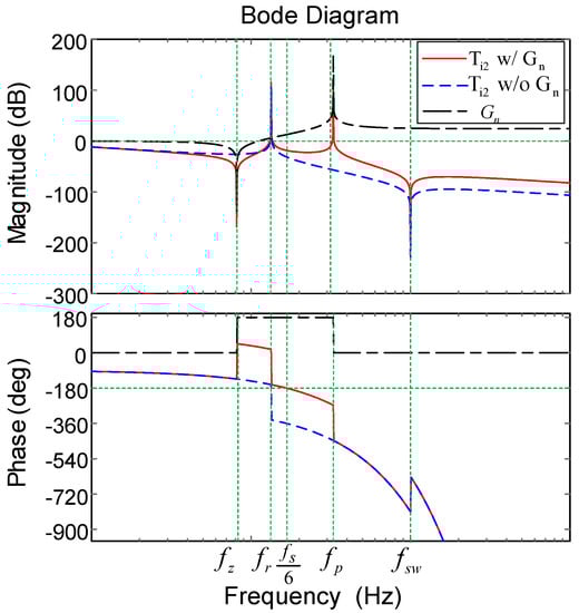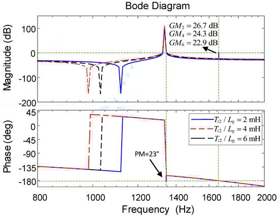 As shown in Figure 6, when BF is not added, can be seen as constant. traverses −180° at and has an infinite resonant peak. When the BF is added, because the BF provides a 180° phase lead, the phase diagram of no longer traverses −180° at , and the −180° crossover is increased from the original to . When grid impedance is considered, the resonant frequency of the system becomes smaller, as shown in Figure 7. is usually set to the minimum value that could achieve to ensure the system is robust enough. It is known from (13) that when is infinity, is the minimum.