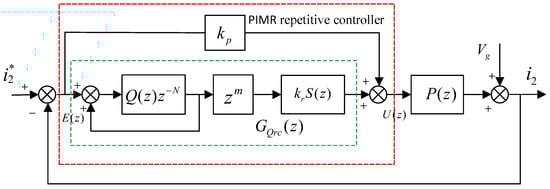 The grid current contains a lot of low-frequency harmonics in the GTI system, so it is essential to choose the appropriate current controller to dispose of it. Because the PIMR repetitive controller has strong harmonic suppression capacity and great dynamic performance, the PIMR repetitive controller is selected in this paper. The controller consists of a repetitive controller in parallel with a proportional gain controller, which reduces a large number of parameters of the traditional proportional multi-resonant controller, its expression in the discrete domain is