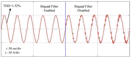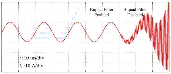 In consideration of the above theory, some literates have introduced a biquad filter (BF) [24], which is mainly to place the resonance point and notch point of BF at the appointed frequency and transfer the resonant peak to the stable region through a phase transition. In this way, the system will not pass through −180° at the resonant peak. Because the BF enables the system to have higher control bandwidth and strong robustness even in the weak power grid environment, it is only briefly introduced in [25]. Therefore, the BF is used in this paper to suppress the resonant peak of the system. Meanwhile, proportional-integral multiresonant (PIMR) repetitive controller [26,27] is used as the current regulator without any sensors and resistors. Simulations show that the proposed algorithm is robust even in weak power grids.
