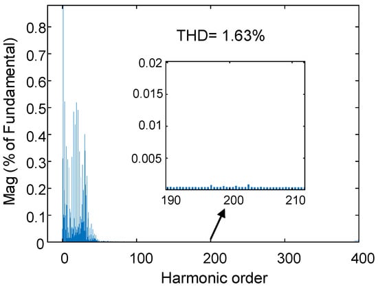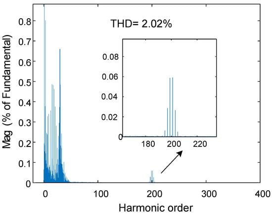 Figure 12 and Figure 13 are the Fourier analysis of the grid-tied current of the LLCL filter and LCL filter under BF respectively. By comparing the Total Harmonic Distortion (THD) of the two figures, we could see that the filtering effect of LLCL GTI is better. And the high-frequency harmonic content of the grid-tied current of the LCL filter at the SF is 0.06%, while that of the LLCL filter is less than 0.001%. It could be known that the high-frequency harmonics at the SF are effectively filtered out by series branches of the LLCL filter, and the low-frequency harmonics are suppressed by PIMR repetitive controller. Figure 14 plots grid voltage and current waveforms of LLCL filter with mH. From Figure 14, the grid-connected current waveform has no large fluctuation and distortion, and the grid voltage and the grid current is in the same phase. Therefore, the proposed control strategy can make the system have better steady-state performance.